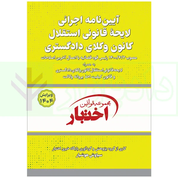 کتاب آیین نامه اجرایی لایحه استقلال قانونی استقلال کانون وکلای دادگستری تدوین سیاوش هوشیار شامل متن آیین نامه اجرایی با اعمال اصلاحات و الحاقات مصوب 1403/3/12 و متن لایحه استقلال کانون وکلای دادگستری با حاشیه نویسی توضیحات تنقیحی میباشد.
