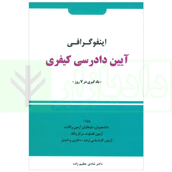 کتاب اینفوگرافی آیین دادرسی کیفری نوشته دکتر شادی عظیم زاده به نکات مهم، آزمونی آیین دادرسی کیفری در قالب جدول به صورت جمع بندی و خلاصه میپردازد.