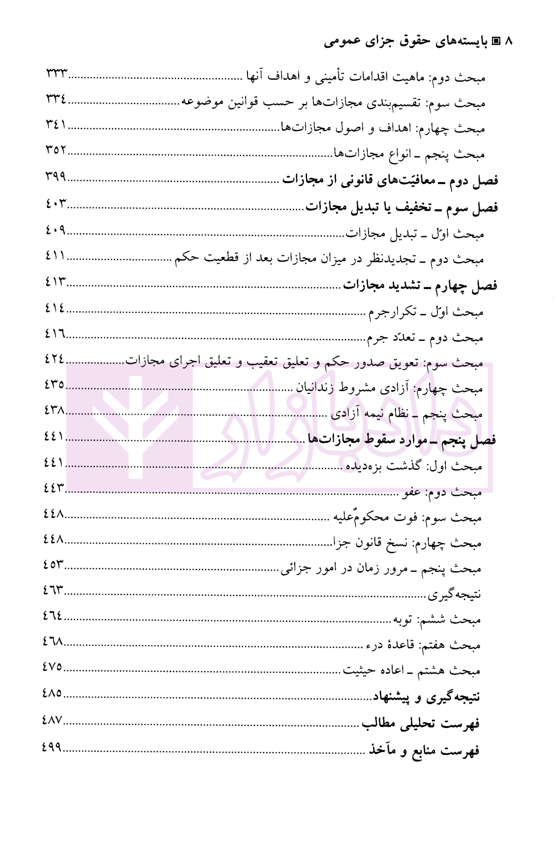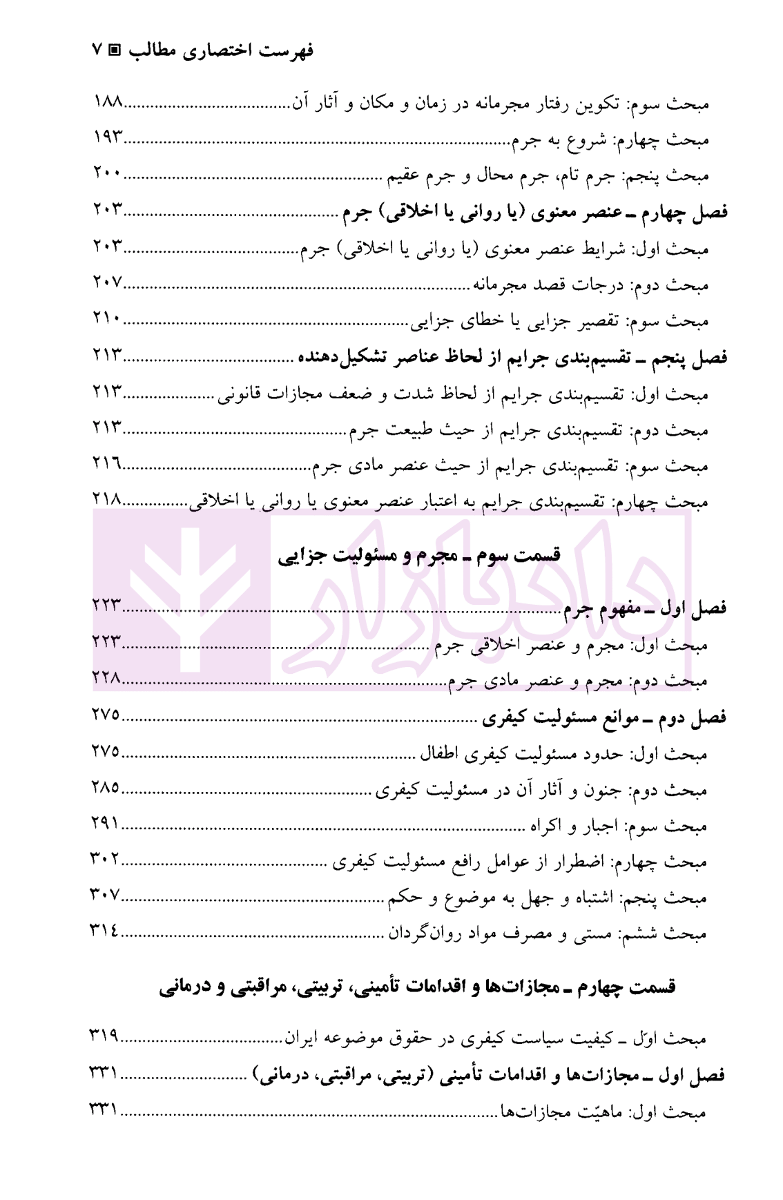 - متناسب با 7 واحد درسی و جهت ارائه در دروس کلیات حقوق جزا، حقوق جزای عمومی 1، 2 و 3 به اختصار و به دور از مطالب غیرضروری تنظیم یافته است.