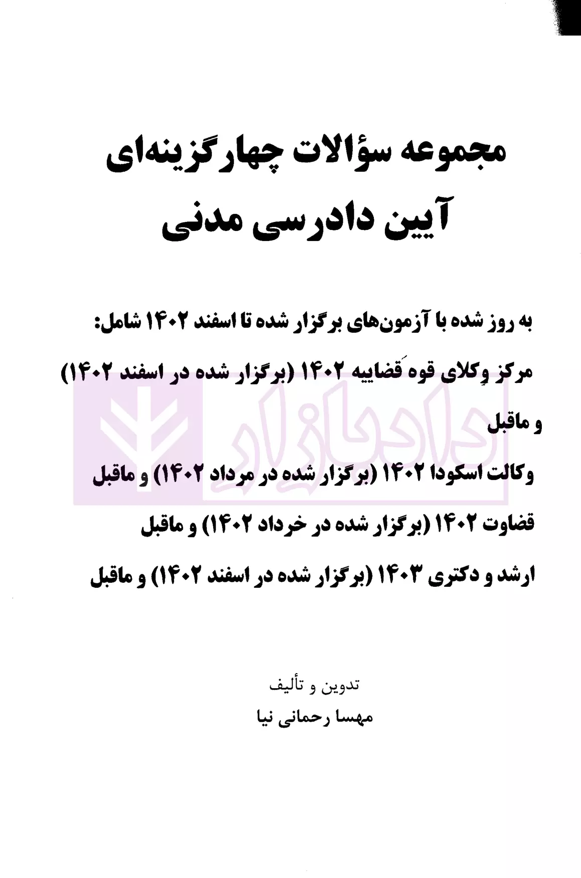 کتاب مجموعه سوالات آیین دادرسی مدنی نوشته مهسا رحمانی نیا شامل سوالات تالیفی و سنوات درس آیین دادرسی مدنی همراه با پاسخنامه تشریحی میباشد.