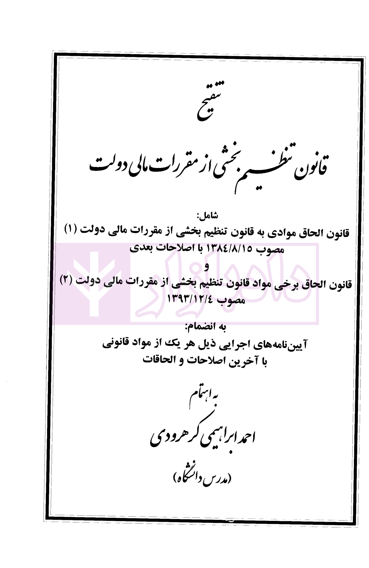 کتاب تنقیح قانون تنظیم بخشی از مقررات مالی دولت نوشته احمد ابراهیمی کرهرودی شامل قوانین و مقررات ملی دولت با آخرین اصلاحات و الحاقات میباشد.