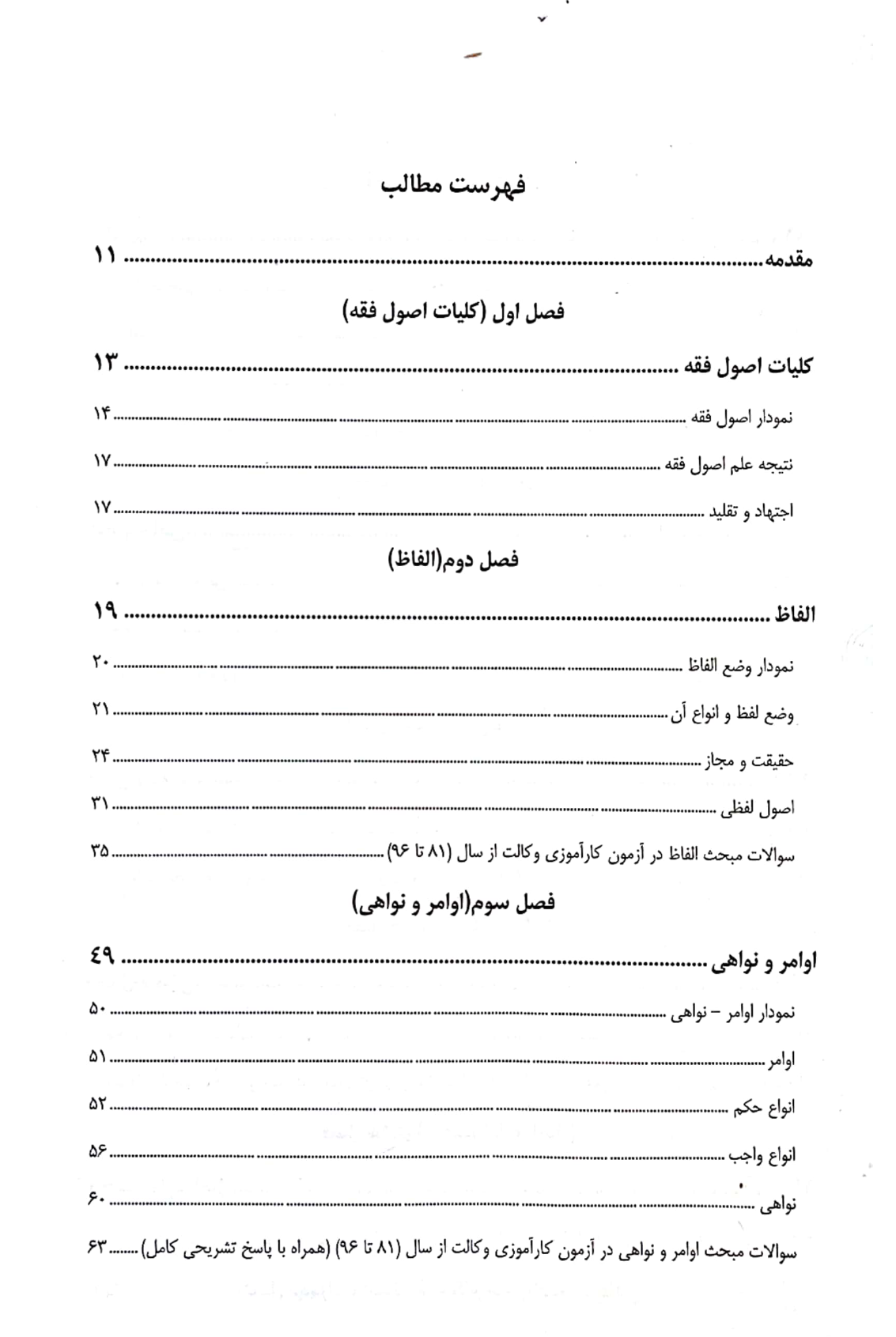 برای هر مبحث ابتدا نمودار درختی آن ترسیم شده است، سپس طرح درس مختصر همراه با مثال برای درک بهتر ارائه شده است. در انتها همه مباحث، سوالات اصول فقه سنوات گذشته آزمون وکالت (سال 81 تا 96) همراه با پاسخ تشریحی قید شده است. همچنین در انتها کتاب، سوالات اصول فقه دکتری 95 و 96 ارائه شده است.