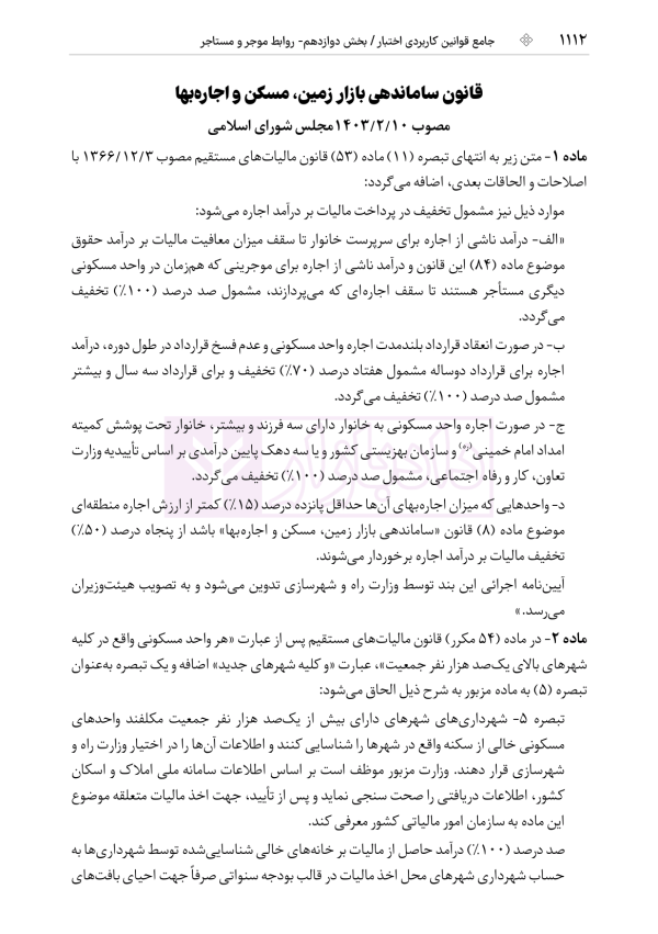 در کتاب جامع قوانین کاربردی اختبار برای رعایت اختصار، از ذکر توضیحات تنقیحی و سایر موارد مرتبط در قالب زیرنویس خودداری شده است، برای در اختیار داشتن قوانین با توضیحات تنقیحی کامل پیشنهاد می شود با توجه به نیاز از سایر کتاب های منتشر شده توسط نشر حقوقی دادبازار استفاده کنید.
