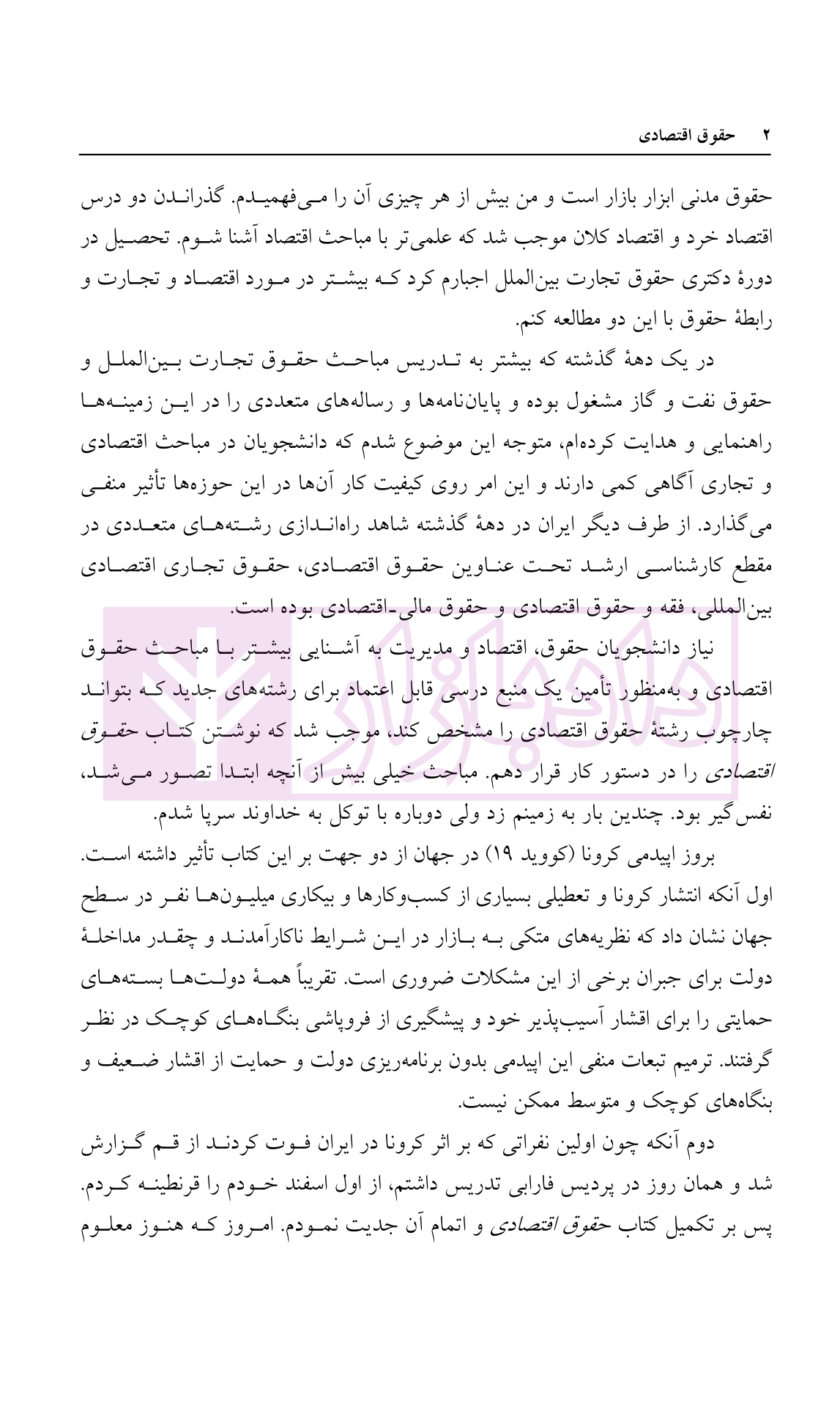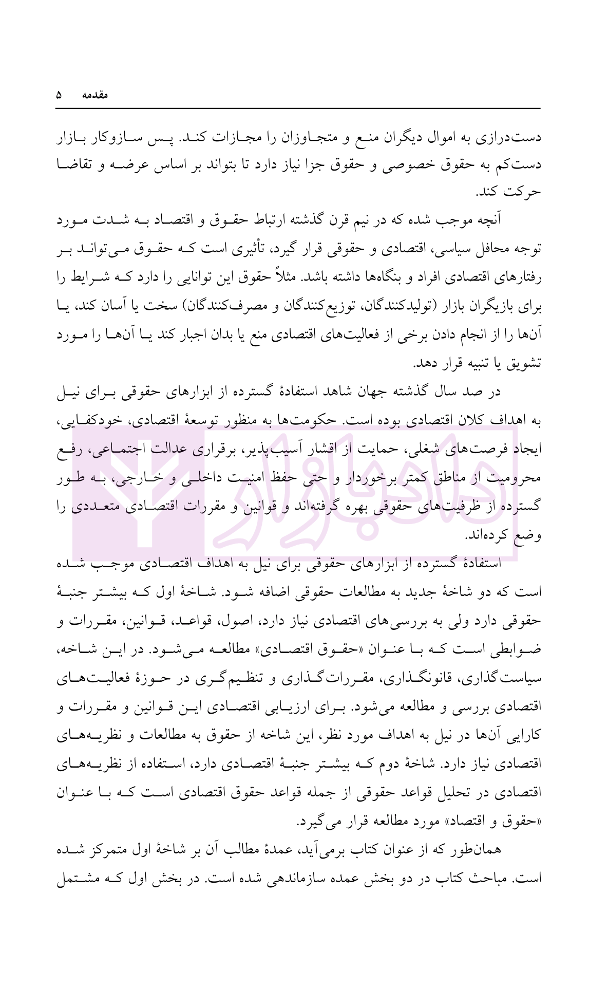 کتاب حاضر برای دانشجویان رشته حقوق در مقطع کارشناسی ارشد و دکتری به عنوان منبع درسهای «حقوق اقتصادی» و «حقوق اقتصادی عمومی» تدوین شده است. این کتاب همچنین میتواند منبع درسی برای دانشجویان رشتههای «حقوق اقتصادی»، «حقـوق مالی ـ اقتصادی» و «فقه و حقوق اقتصادی» باشد.