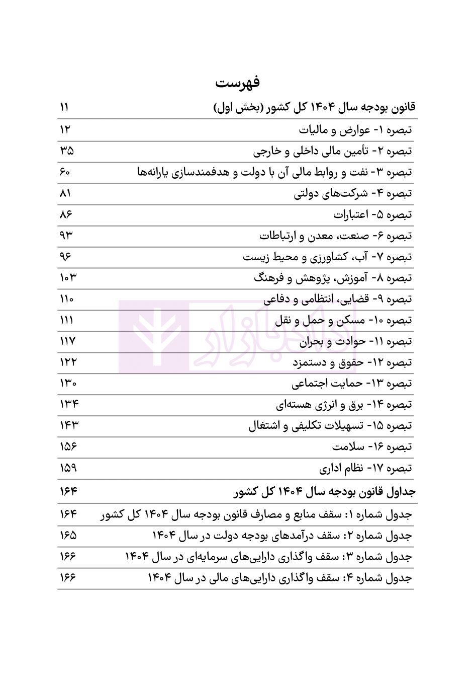 فهرست عناوین کتاب قانون بودجه سال ۱۴۰۴ بخش اول