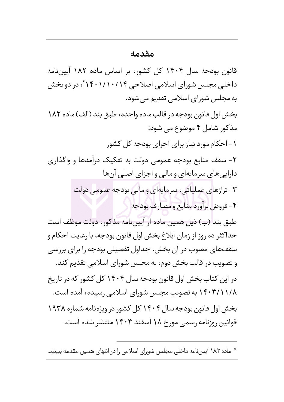 قانون بودجه سال ۱۴۰۴کل کشور، بر اساس ماده 182 آیین نامه داخلی مجلس شورای اسلامی اصلاحی 1401/10/14 در قالب جدید و در دو بخش به مجلس شورای اسلامی تقدیم میشود.