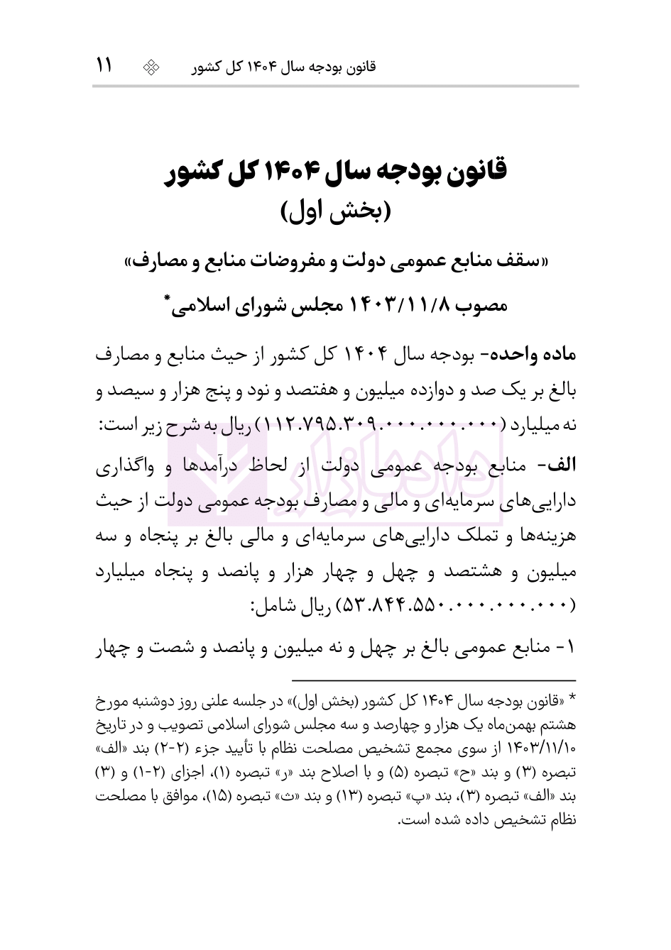قانون بودجه سال ۱۴۰۴کل کشور (بخش اول)