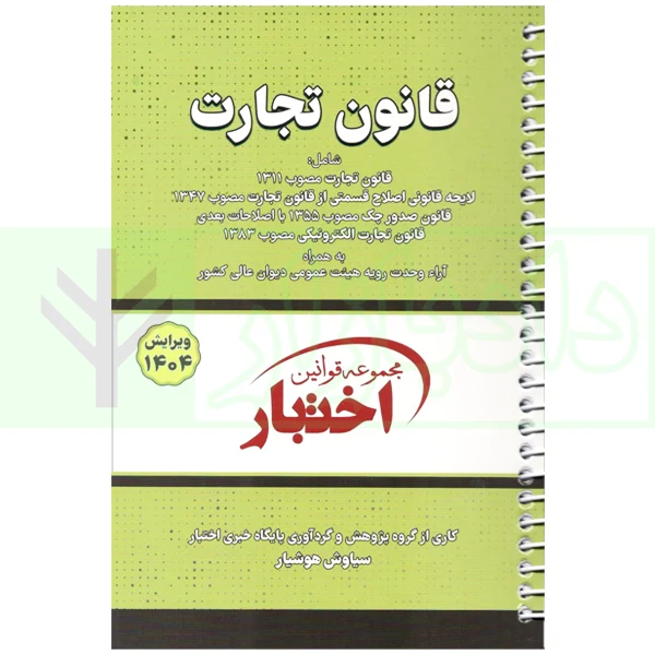 کتاب قانون تجارت سیمی کاری از گروه پژوهش و گردآوری پایگاه خبری اختبار به سرپرستی سیاوش هوشیار شامل مواد قانون همراه با آخرین آرای وحدت رویه و زیرنویس تنقیحی میباشد.
