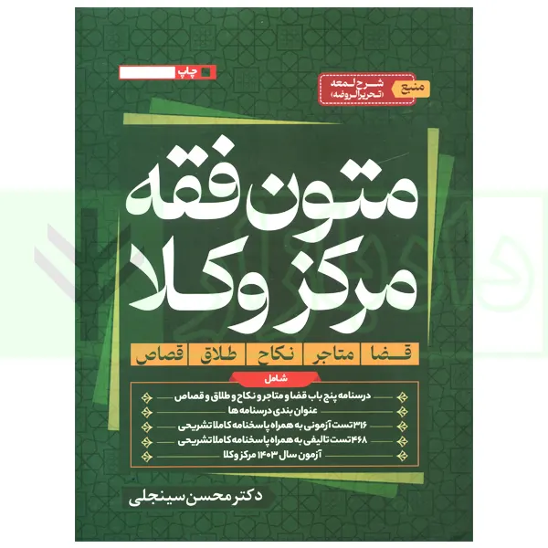 کتاب متون فقه مرکز وکلا نوشته دکتر محسن سینجلی شامل درسنامه ابواب قضا، متاجر، نکاح، طلاق، قصاص منبع فقه آزمون مرکز وکلای قوه قضاییه همراه با تست آزمونی و سوالات تالیفی می‌باشد.