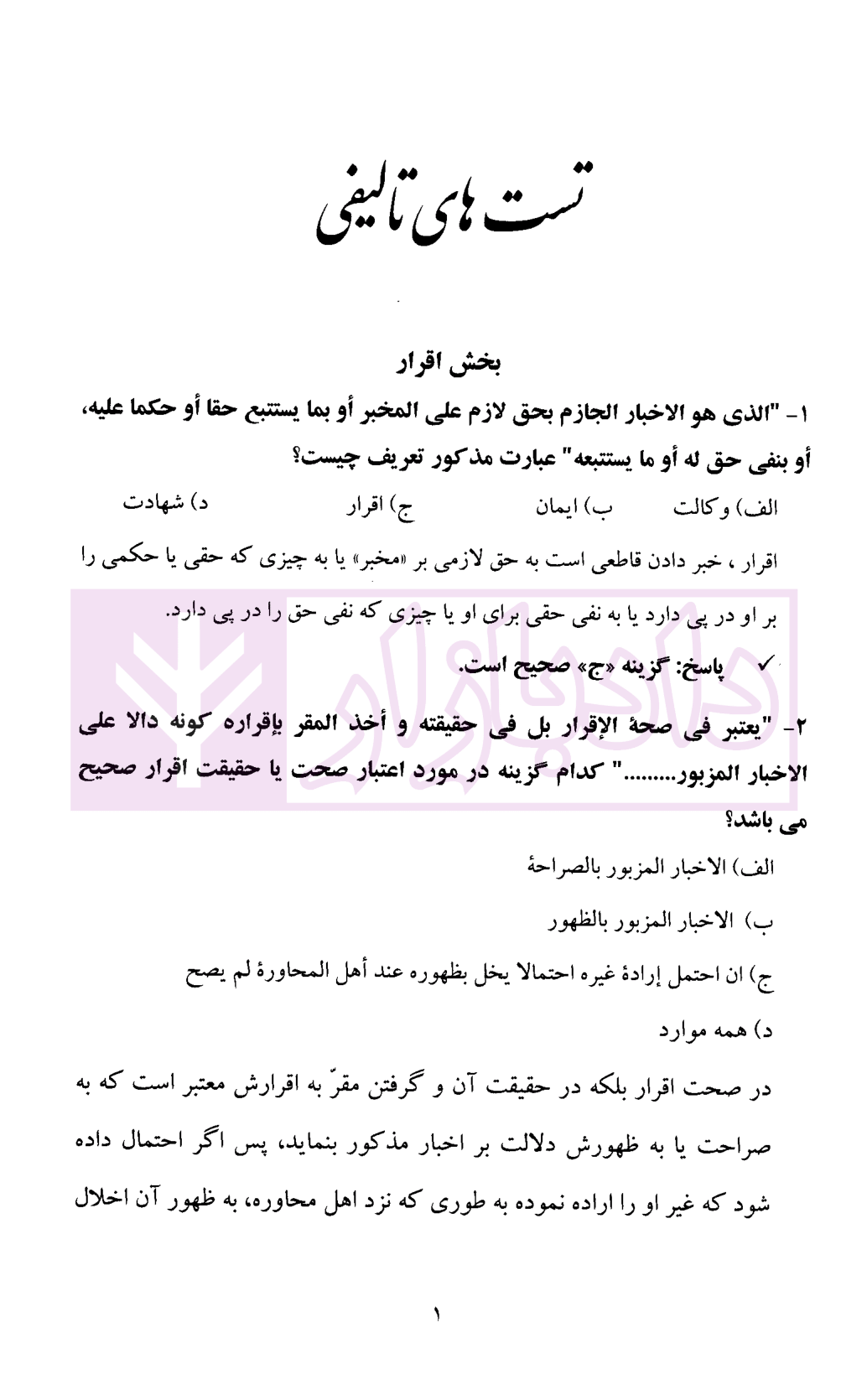 - شامل تست های تالیفی همراه با سوالات دارای گزینه های عربی (در آزمونهای اخیر عمده تست ها شامل گزینه عربی بوده اند)