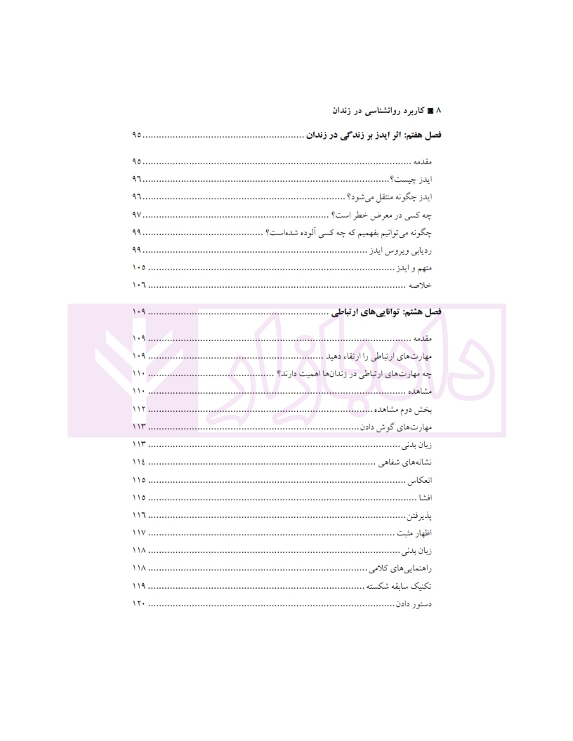 فصل هشتم تحت عنوان تواناییهای ارتباطی بر اهمیّت مهارتهای ارتباطی زندانیان تأکید و مهارتهایی مثل گوش دادن مؤثر، مشاهده، زبان بدنی و انواع مهارتهای ارتباطی کلامی به صورت مشروح پرداخته شده است.