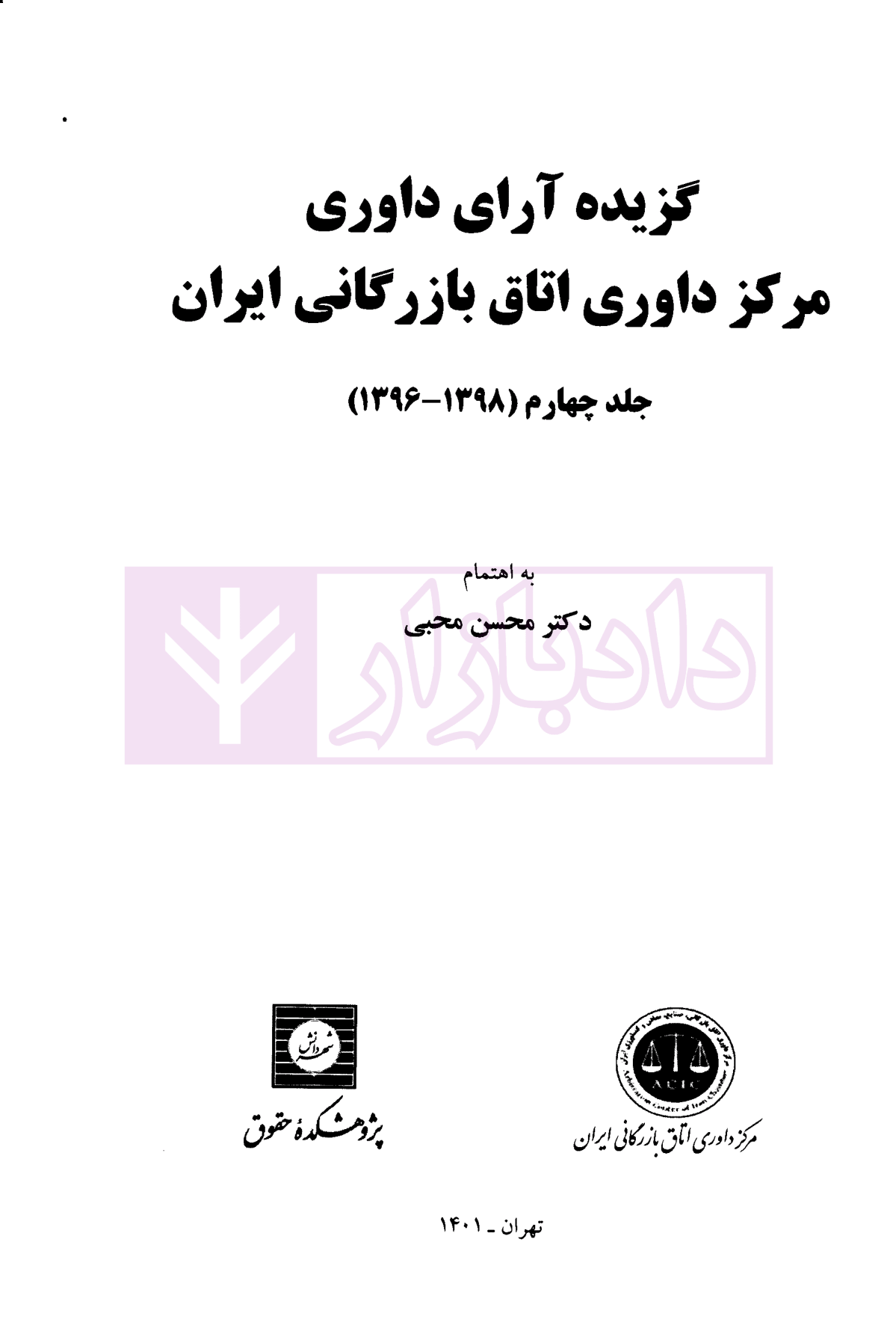 کتاب گزیده آرای داوری مرکز داوری اتاق بازرگانی ایران جلد چهارم گردآوری دکتر محسن محبی شامل گردآوری آرای برگزیده سال های ۱۳۹۶ تا ۱۳۹۸ مرکز داوری اتاق بازرگانی ایران میباشد.